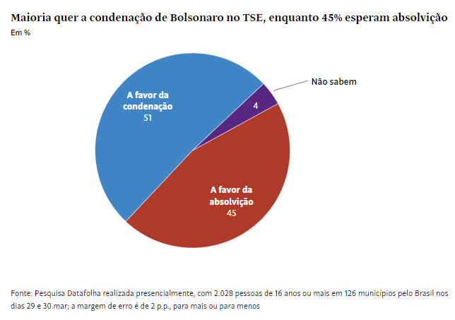 Metade dos eleitores brasileiros quer que Jair Bolsonaro (PL) seja condenado por sua campanha contra as urnas eletrônicas e se torne inelegível por oito anos, conforme prevê a lei. Outros 45% acreditam que ele é inocente e deveria ser poupado pelo TSE (Tribunal Superior Eleitoral).