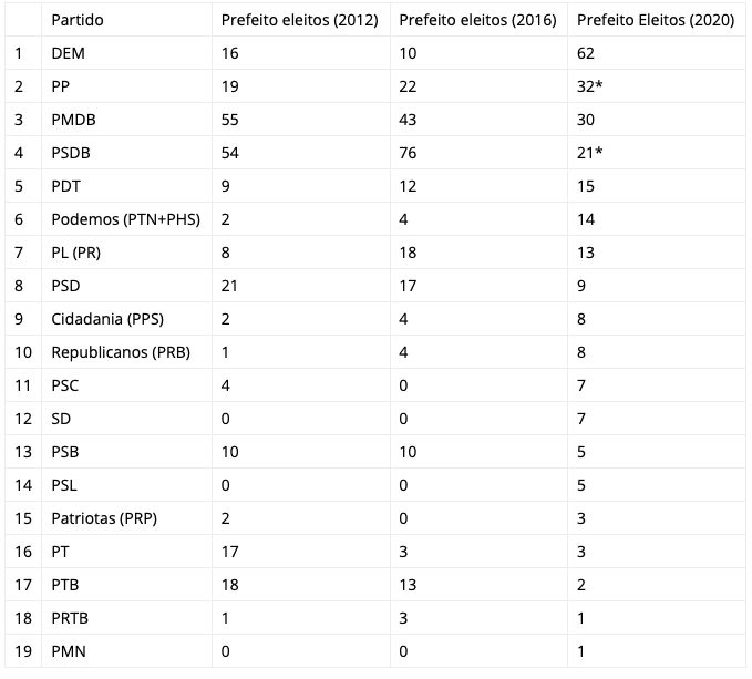 Já o PP teve 19 prefeitos eleitos, em 2012, e 22, em 2016. Nas disputas atuais, a sigla conseguiu novo recorde, com a eleição de 32* candidatos.