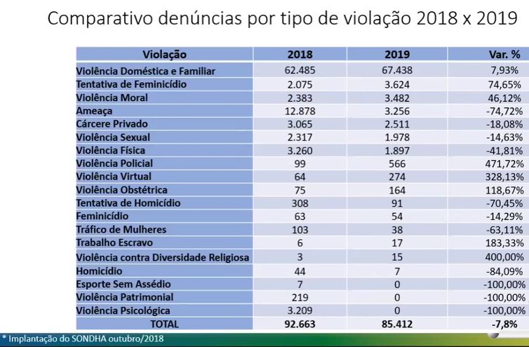 De acordo com Ferreira, isso também vale para os casos de violência moral, cujas denúncias aumentaram 46% de 2018 para 2019. E também para a redução das denúncias de violência psicológica (-100%) e patrimonial (-100%), duas classificações redefinidas e cujos casos relatados no ano passado foram somados à categoria violência doméstica e familiar – contribuindo para o aumento do número de registros deste último tipo de denúncia.
