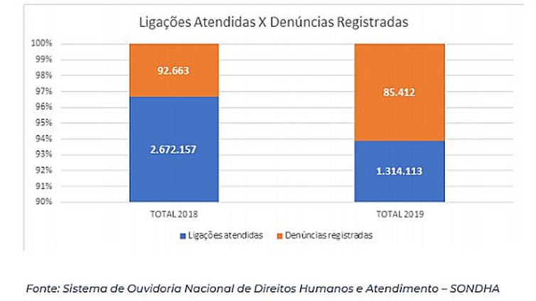 Também chamam a atenção o aumento de 471% no número de denúncias de violência policial contra mulheres e o crescimento de 400% da violência contra a diversidade religiosa. No primeiro caso, os registros passaram de 99 queixas em 2018, para 566 notificações em 2019. Já no segundo caso, os telefonemas para o Ligue 180 passaram de três para 15.