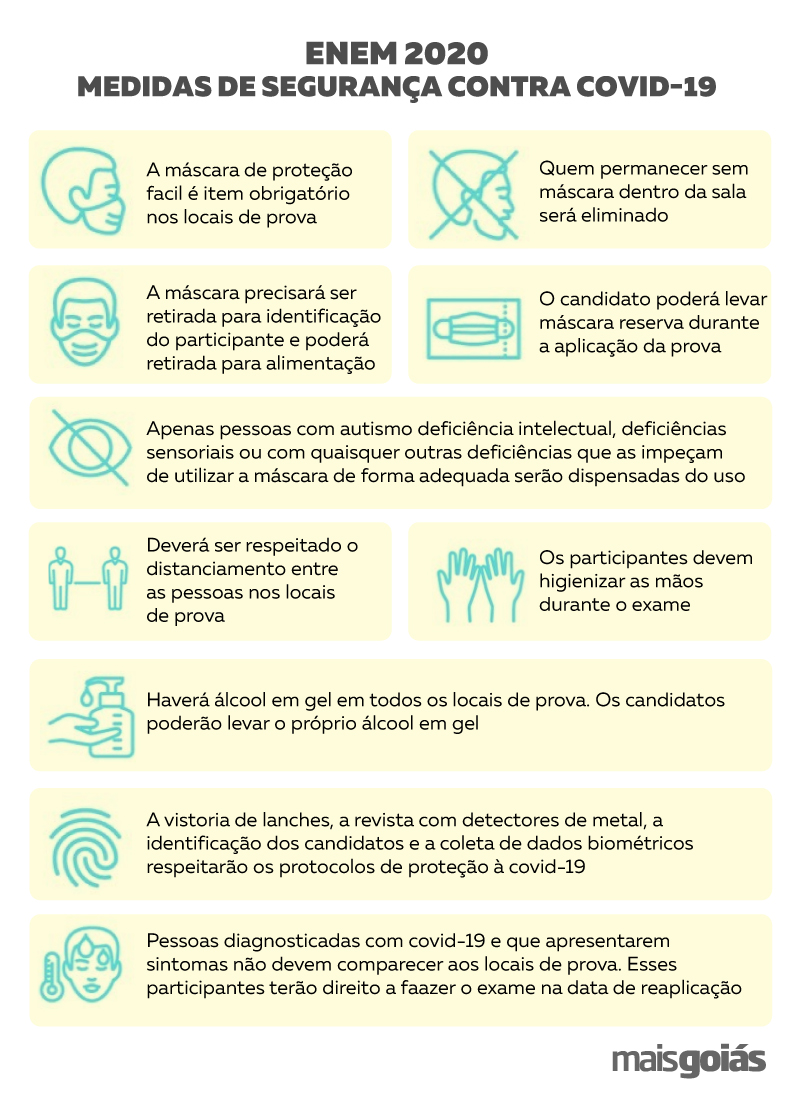 Dentro de sala, os estudantes deverão permanecer com a máscara durante toda a realização do exame. O edital prevê que a máscara deve ser usada da maneira correta, cobrindo o nariz e a boca. Caso isso não seja feito, o participante será eliminado. Os candidatos poderão levar máscaras para trocar durante a aplicação, seguindo a recomendação de especialistas da área de saúde.