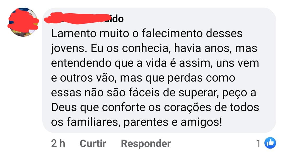 Pelas redes sociais, amigos e familiares lamentaram as perdas. “Lamento muito o falecimento desses jovens. Eu os conhecia havia anos […]. Deus conforte os corações de todos os familiares, parentes e amigos.