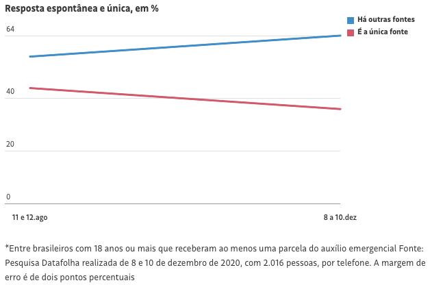A dependência dessa política, no entanto, caiu nos últimos meses, período em que o valor pago pelo governo foi reduzido pela metade. No levantamento feito em agosto, 44% apontavam o auxílio como única fonte de renda.