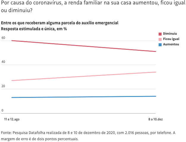 Entre os que receberam o benefício emergencial, a parcela daqueles que sofreram uma redução de renda caiu de 60% em agosto para 51% em dezembro —ou seja, são pessoas que, mesmo com o auxílio, não evitaram um impacto negativo sobre sua renda.