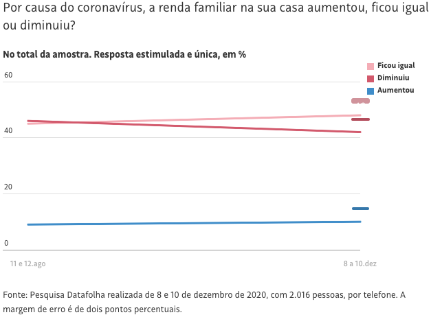 Ainda de acordo com a pesquisa, o percentual de pessoas que perderam renda por causa da pandemia era de 46% em agosto, número que caiu para 42% dos entrevistados em dezembro.