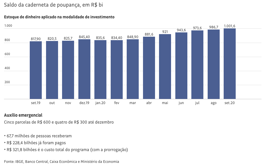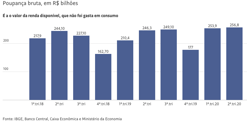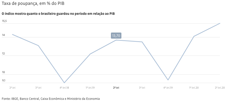 Dados mostram que o brasileiro guardou dinheiro durante a pandemia. No segundo trimestre, período em que a crise foi mais acentuada, a taxa de poupança do brasileiro cresceu 1,4 ponto percentual e ficou em 15,5% do PIB (Produto Interno Bruto).