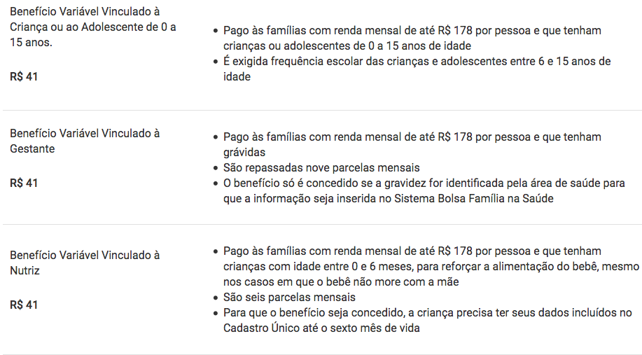 - Pago às famílias que continuem com renda mensal por pessoa inferior a R$ 89, mesmo após receberem os outros tipos de benefícios do programa
