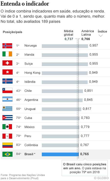 O Brasil caiu cinco posições no ranking de desenvolvimento humano das Nações Unidas, que mede o bem-estar da população considerando indicadores de saúde, escolaridade e renda. Dados divulgados pelo Programa das Nações Unidas para o Desenvolvimento (Pnud) mostram que o país recuou da 79ª posição em 2018 para a 84ª em 2019. A estagnação na educação foi a principal causa do resultado.