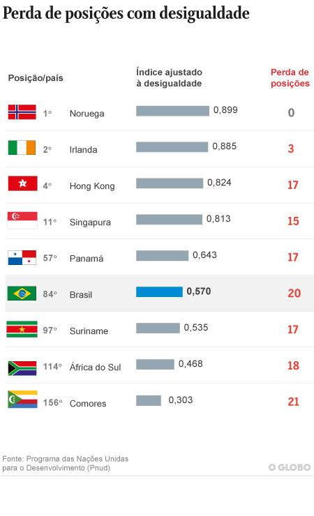 É a segunda nação que mais perde posições, atrás apenas de Comores, um país do leste da África com 830 mil habitantes. O IDH ajustado para a desigualdade é calculado para 150 países.