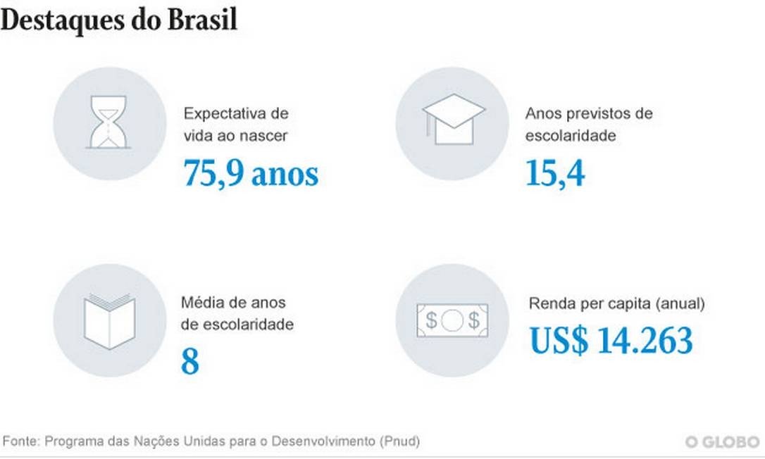 Apesar de o país não ter recuado nos indicadores de saúde, escolaridade e renda avaliados, outros países cresceram mais que o Brasil, por isso a queda de posição. O Índice de Desenvolvimento Humano (IDH) brasileiro é de 0,765.