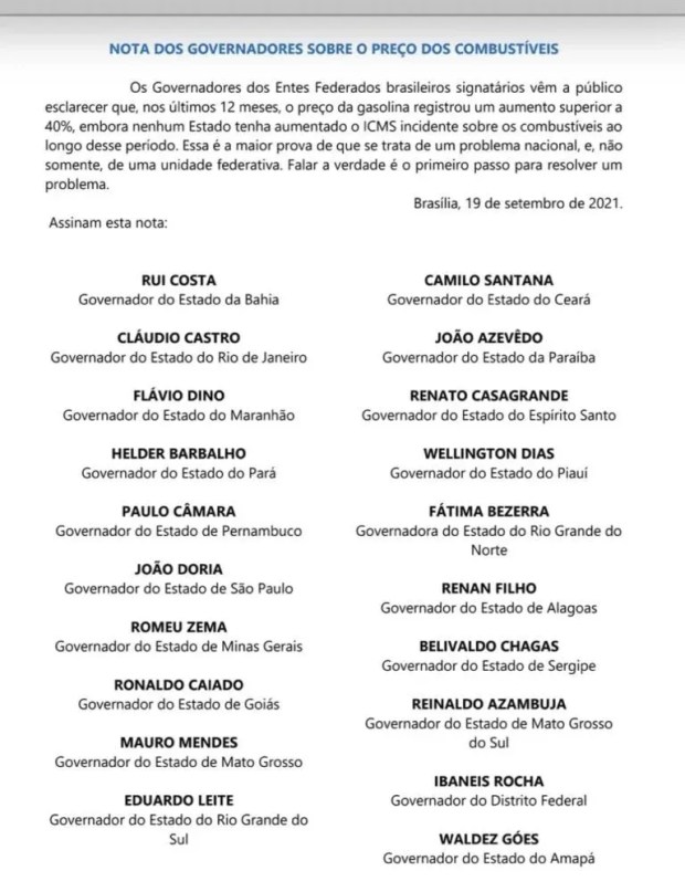 “Os governadores dos entes federados brasileiros signatários vêm a público esclarecer que, nos últimos 12 meses, o preço da gasolina registrou um aumento superior a 40%, embora nenhum Estado tenha aumentado o ICMS incidente sobre os combustíveis ao longo desse período“, inicia a nota.