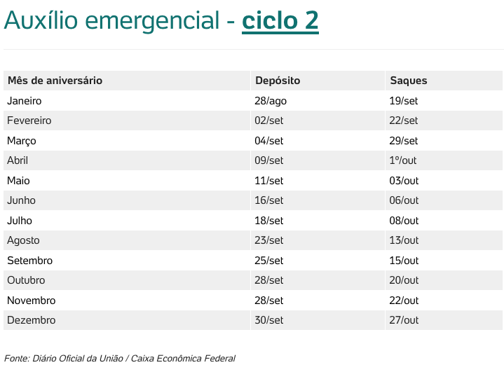 A fase de depósitos do ciclo 2 terminou em 30 de setembro. No entanto, a Caixa seguira liberando saques e transferências até 27 de outubro, conforme a coluna da direita do cronograma abaixo: