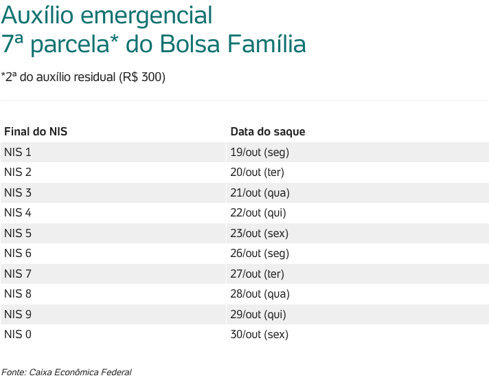 A sétima parcela será liberada entre os dias 19 e 30 de outubro, conforme o dígito final do NIS (Número de Identificação Social):