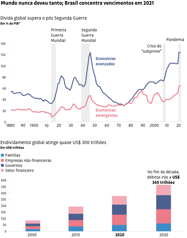 Para governos de nações emergentes como o Brasil, essa montanha de débitos exigirá, já em 2021, um grande esforço de refinanciamento. Juntas, as 30 maiores nações em desenvolvimento têm cerca de US$ 7 trilhões em débitos estatais vencendo neste ano.