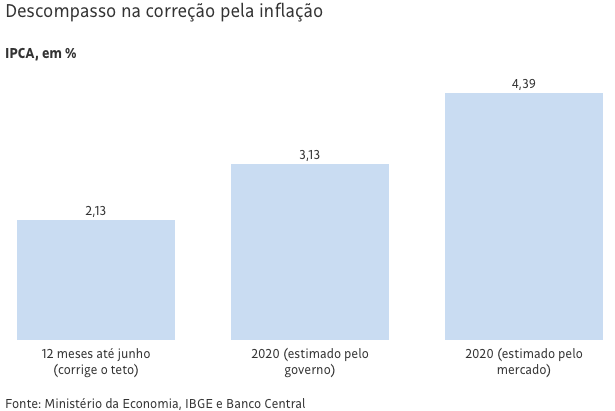 A inflação acelerou no segundo semestre. O limite máximo para as despesas foi reajustado com base no índice até o primeiro semestre (2,13%, acumulado de 12 meses encerrados em junho). Mas a expectativa do mercado é que o IPCA (índice oficial de inflação) suba para cerca de 4,4% no fim do ano.