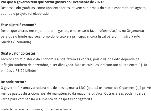 Guedes, apesar da pressão sobre o teto em 2021, tem garantido que o teto será cumprido. Para ele, se essa regra for flexibilizada, haverá fuga de investidores, comprometendo a retomada da economia.