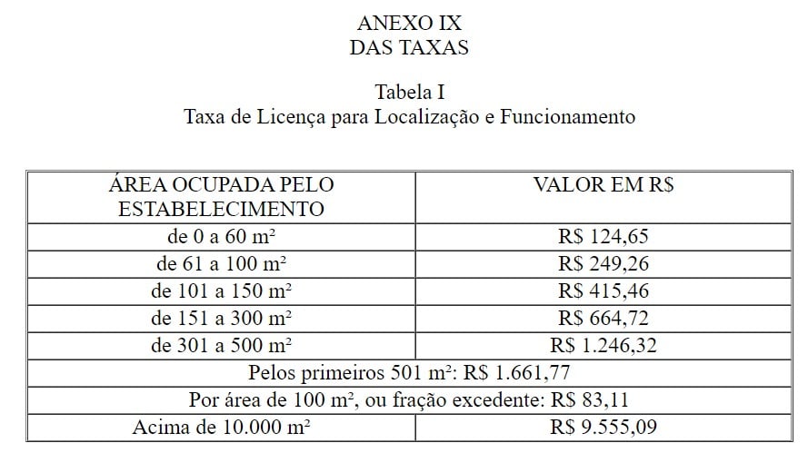 Com a nova forma de cálculo, verifica-se a área ocupada pelo estabelecimento. De a 0 a 60 m², R$ 124,65; de 61 a 100 m², R$ 249,26; de 101 a 150 m², R$ 415,46; de 151 a 300 m², R$ 664,72; de 301 a 500 m², R$ 1.246,32; pelos primeiros 501 m², R$ 1.661,77 – com a soma de R$ 83,11 por área de 100 m² ou fração excedente. Por fim, acima de 10 mil m², R$ 9.555,09.