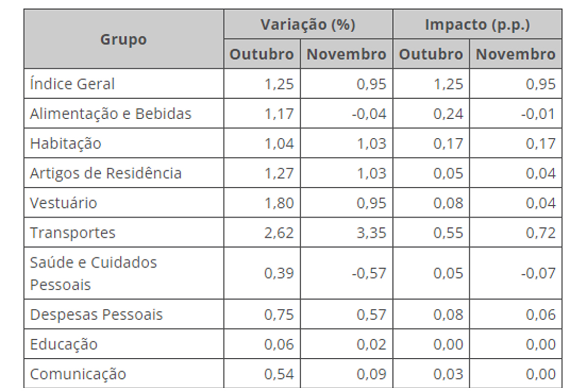 Ao todo, nove produtos e serviços entraram no radar da pesquisa. Sete tiveram alta. A maior variação e impacto, em novembro, foi nos Transportes: 3,35% e 0,72 p.p. (ponto percentual). Esse grupo representou 76% de todo o índice do mês.