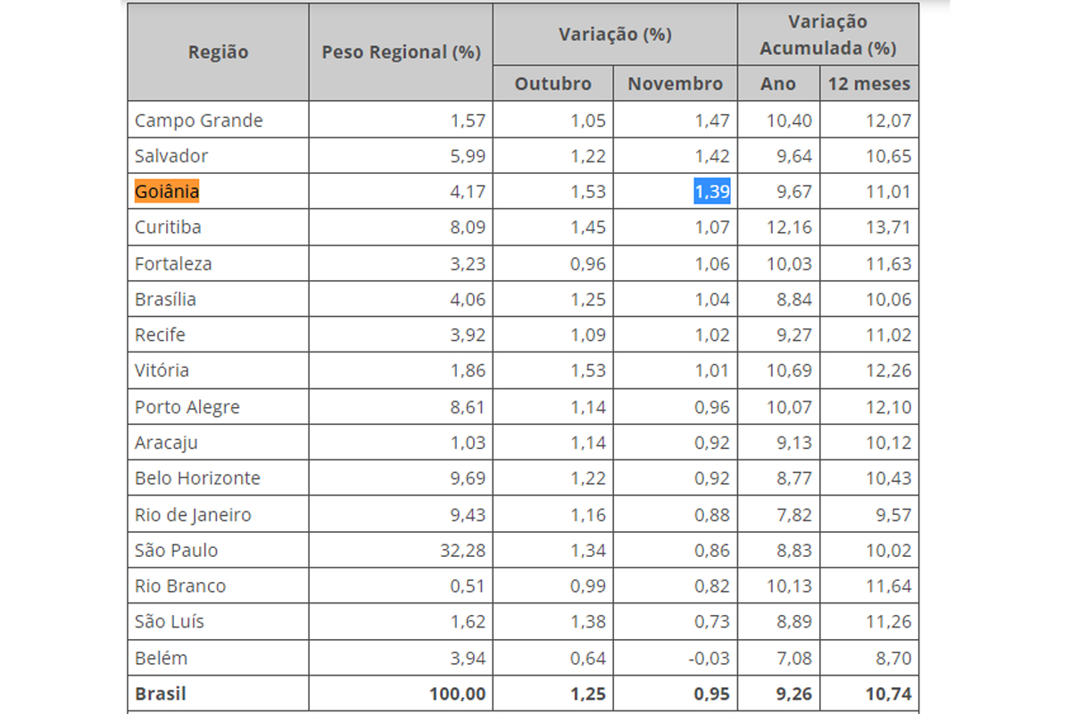 No acumulado do ano, Goiânia chega a 9,67%. Em relação aos últimos 12 meses, 11,01%. Já no País, foram 9,26% no ano e 10,74% nos últimos 12 meses.