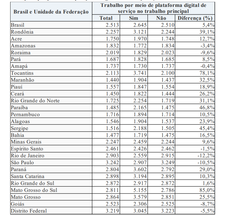 Em relação ao período trabalhado por semana, em Goiás as pessoas ocupadas por aplicativo trabalharam 44 horas em média no ano passado, 3,6 horas a mais do que os não plataformizados (40,4 horas). “Nesse quesito, todos os estados apresentaram média de horas semanais trabalhadas dos plataformizados superior à dos não plataformizados, sendo as médias nacionais de 46 horas e de 39,5 horas, respectivamente”, pontua.