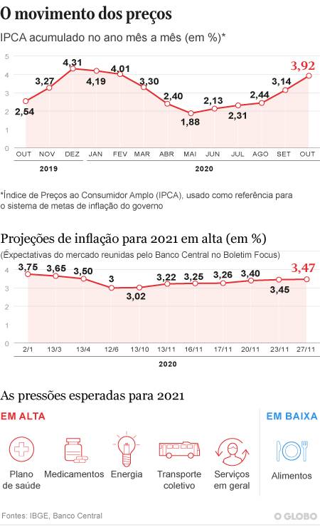 — Não dá para dizer que está tranquilo e que não tem preocupação com inflação. Não estamos vendo arrefecer o preço das commodities agrícolas (como soja e milho) com a retomada da China, que deve crescer 8% no ano que vem. Os preços dos alimentos talvez subam menos (em 2021), mas será uma pressão em cima de uma alta de 16% este ano — diz o economista-chefe da MB Associados, Sergio Vale.