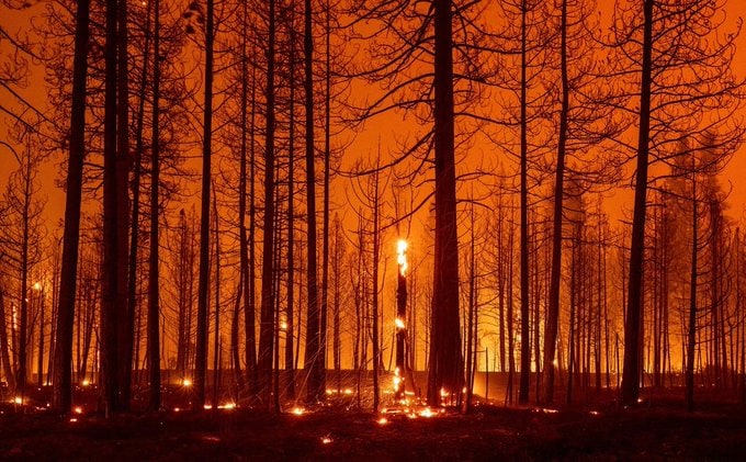 As equipes de bombeiros ainda trabalhavam ontem para combater os incêndios em Greenville, cerca de 260 quilômetros ao norte de Sacramento, após o incêndio chamado de Dixie Fire avançar por toda a noite anterior.