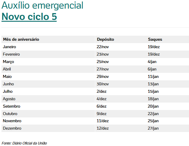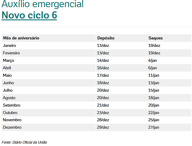 No total, serão seis ciclos de pagamento, com depósitos até 29 de dezembro e saques até 27 de janeiro.