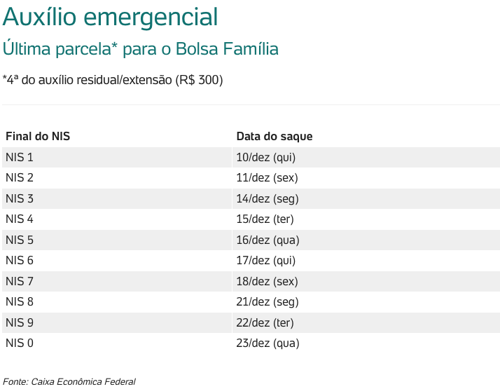A quarta e última parcela da extensão será liberada para o público do Bolsa Família conforme o dígito final do NIS, nas seguintes datas: