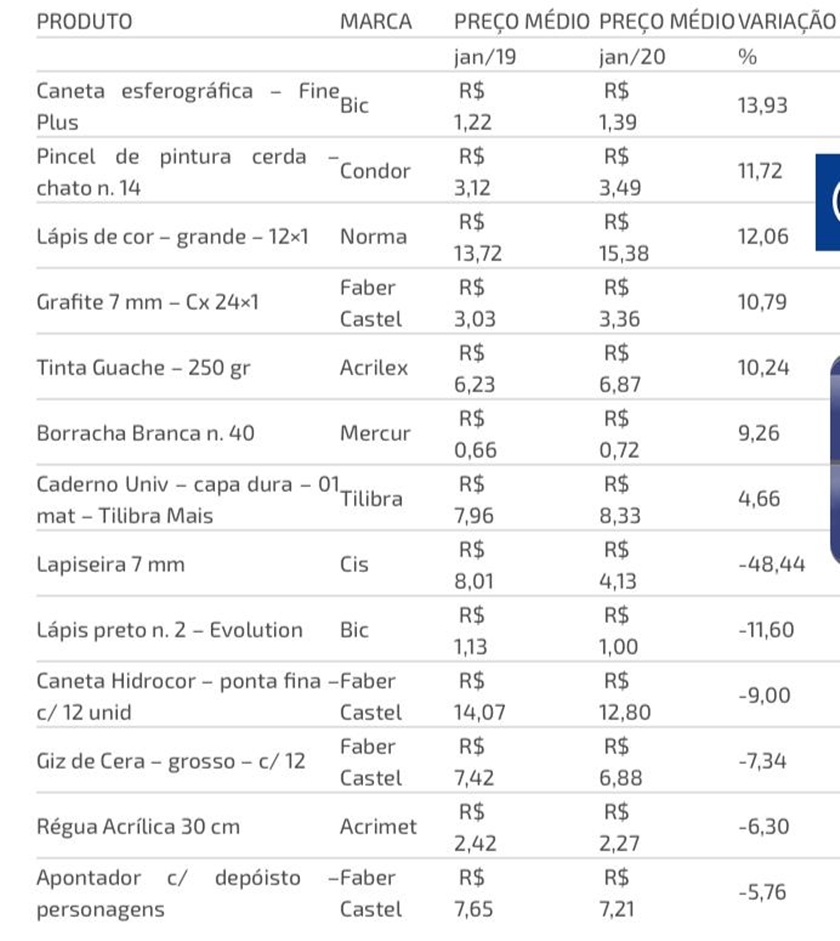 A pesquisa também concluiu que os produtos estão 4,22% mais baratos em comparação a 2019. Um exemplo é a lapiseira 7 mm, da marca Cis, que custava R$ 8,01 em 2019 e baixou para R$ 4,13 neste ano.