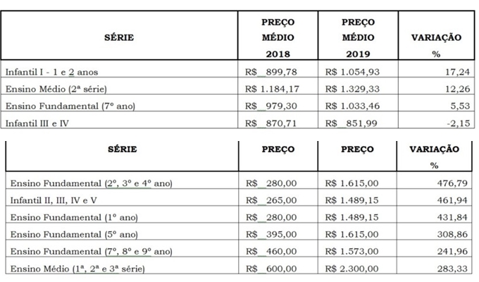 Tabela de variações dos preços nas escolas particulares (Foto: Reprodução/Procon)