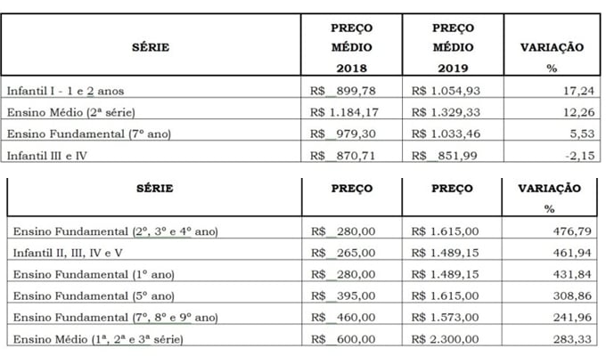 A maior variação foi identificada no Ensino Fundamental para o 2º, 3º e 4º anos. O menor valor da mensalidade foi de R$ 280,00 e o maior foi de R$ 1.615,00, variação de 476,79%. O Procon sugere uma leitura minuciosa no contrato das escolas, e informa que configura cláusula abusiva a rescisão do contrato durante o ano letivo vigente pelo motivo de inadimplência.