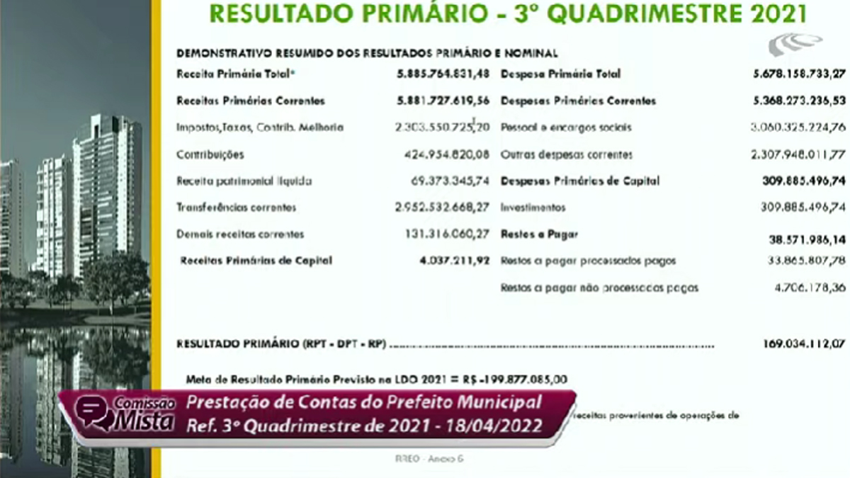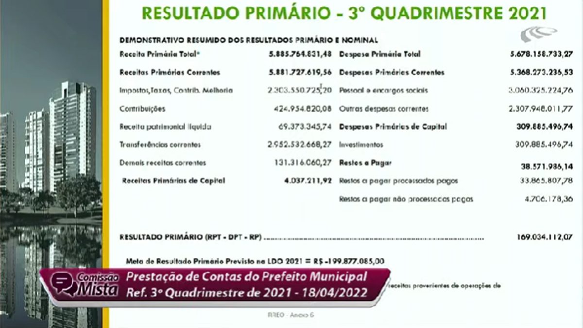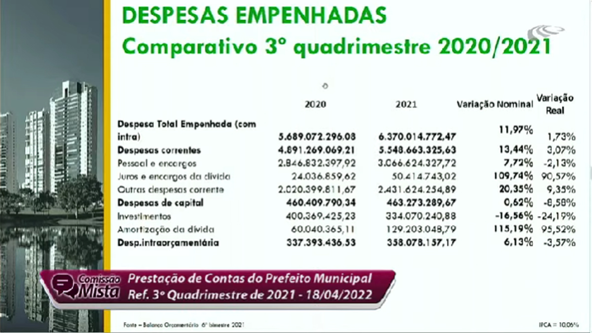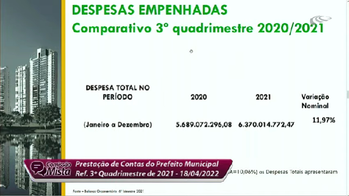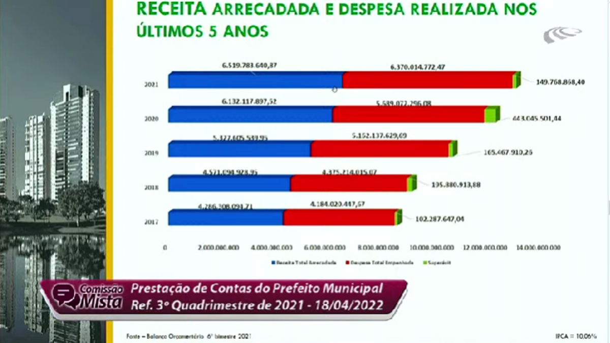 Ao detalhar os números, o secretário de Finanças, Vinícius Henrique Pires Alves, também apresentou as informações consolidadas dos 12 meses do ano passado. Ele revelou que a despesa total empenhada (intra) foi R$ 6.370.014.772,47. Houve um aumento em relação a 2020, “por causa da inflação”, quando foi de R$ 5.689.072.296,08. “Mesmo com os desafios, encerramos 2021 com superávit orçamentário de R$ 149.768.868,40“, declarou.