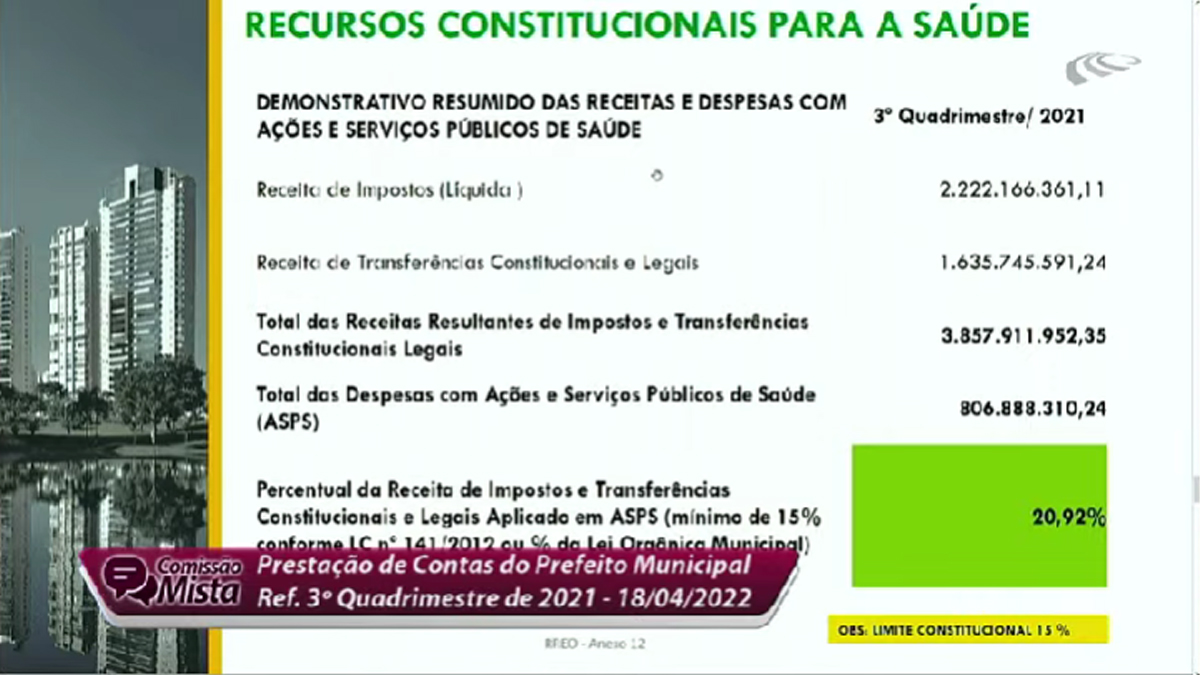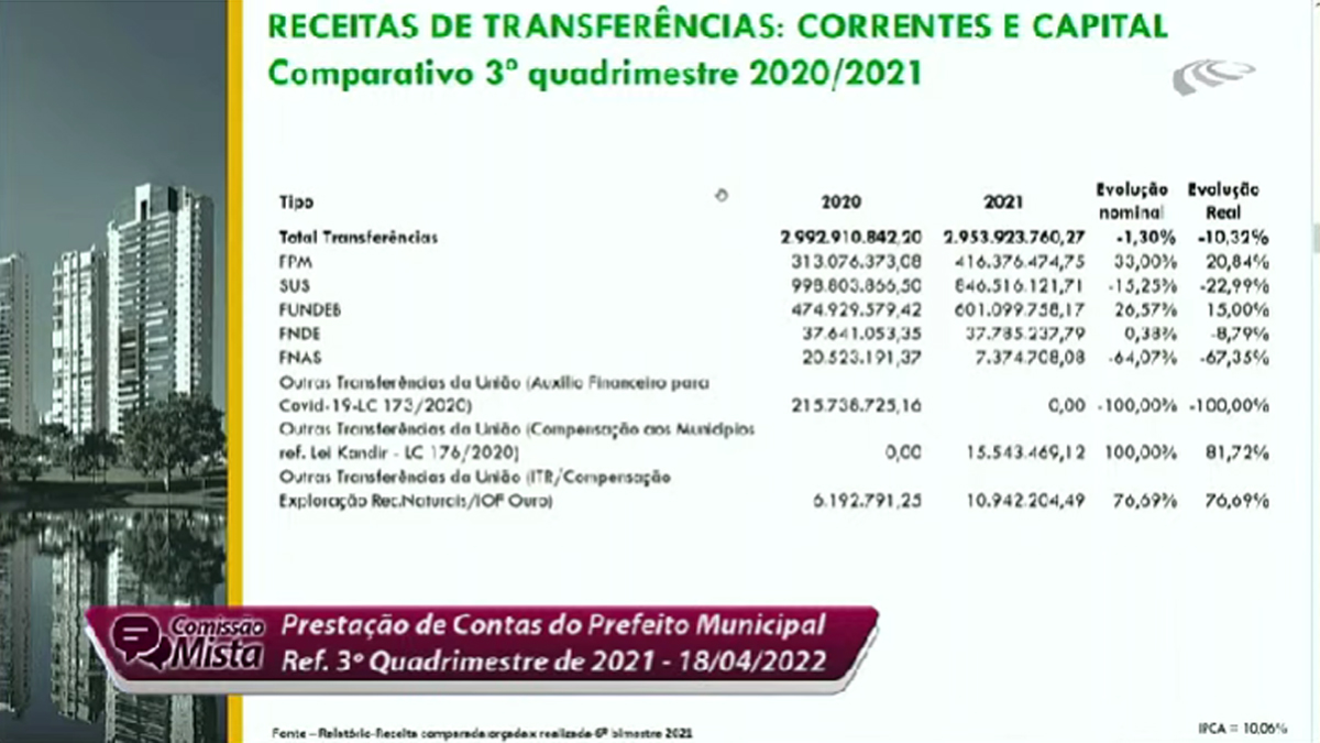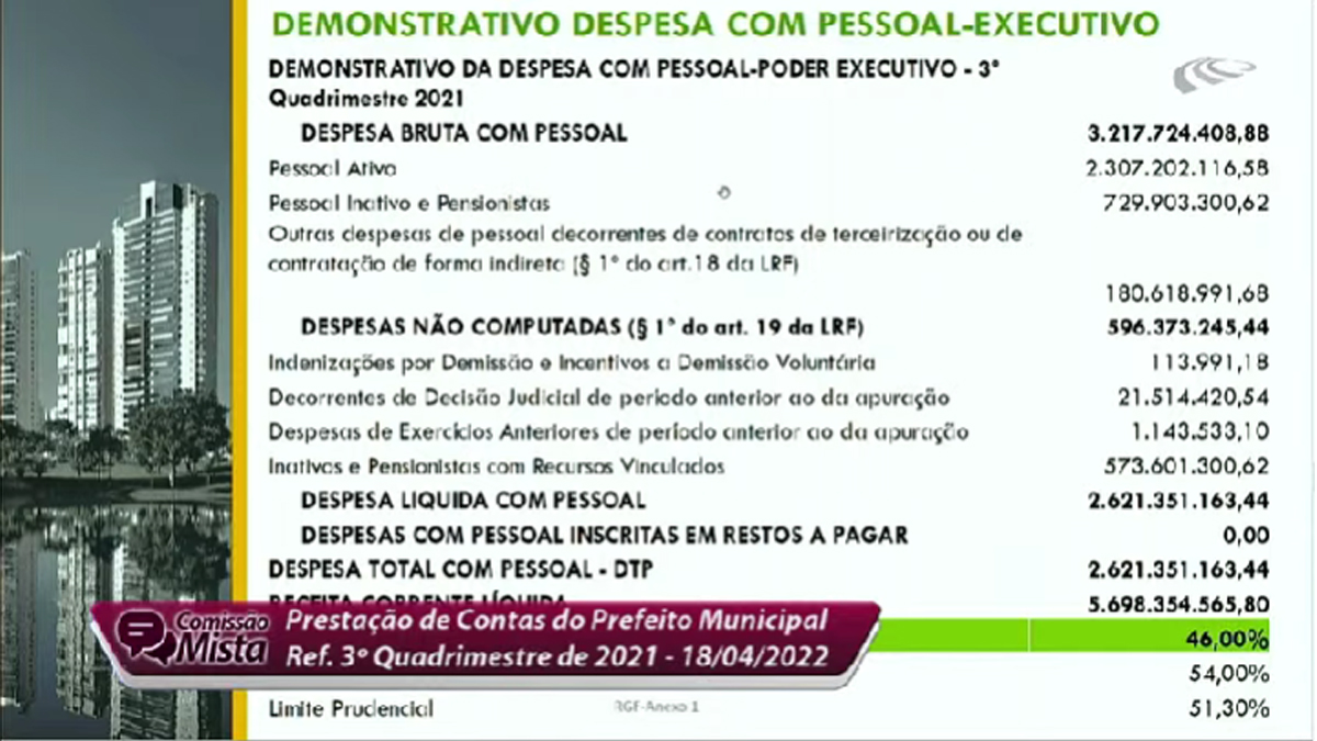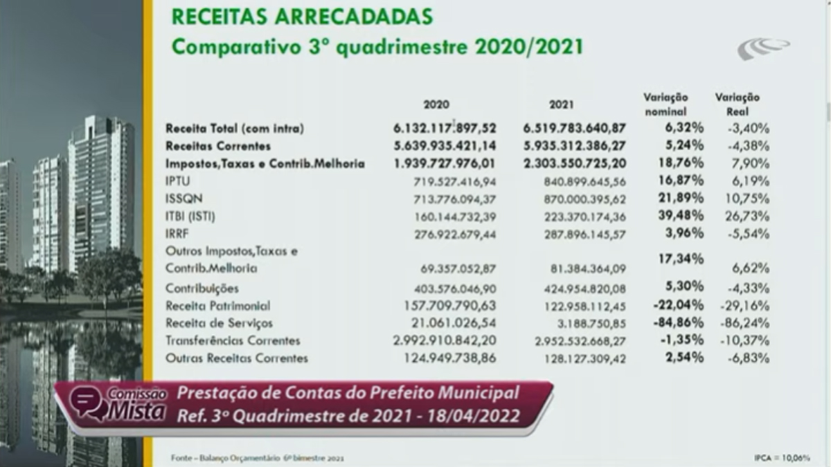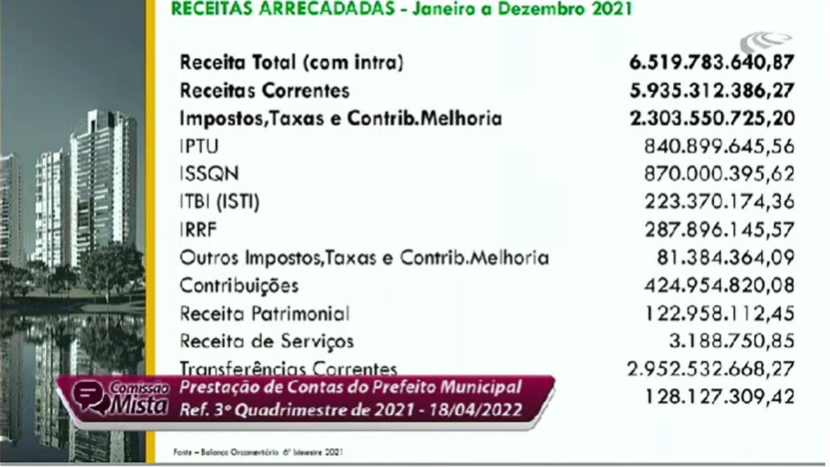 Ao detalhar os números, o secretário de Finanças, Vinícius Henrique Pires Alves, também apresentou as informações consolidadas dos 12 meses do ano passado. Ele revelou que a despesa total empenhada (intra) foi R$ 6.370.014.772,47. Houve um aumento em relação a 2020, “por causa da inflação”, quando foi de R$ 5.689.072.296,08. “Mesmo com os desafios, encerramos 2021 com superávit orçamentário de R$ 149.768.868,40“, declarou.