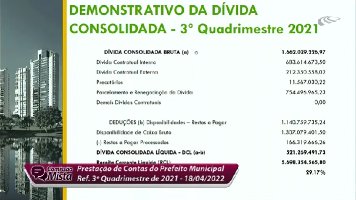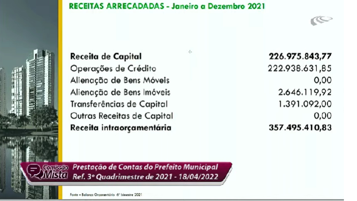 O prefeito de Goiânia, Rogério Cruz (Republicanos), prestou contas de gestão do 3º quadrimestre de 2021, nesta segunda-feira (18), na Câmara Municipal. Na verdade, em vez de focar nos últimos quatro meses, o gestor falou do ano todo. A receita total intra-orçamentária nos 12 meses foi de R$ 6,5 bilhões, cerca de 6% a mais que em 2020 – essa receita é aquela para despesas correntes, como as manutenções contínuas da administração municipal, órgãos e serviços.
