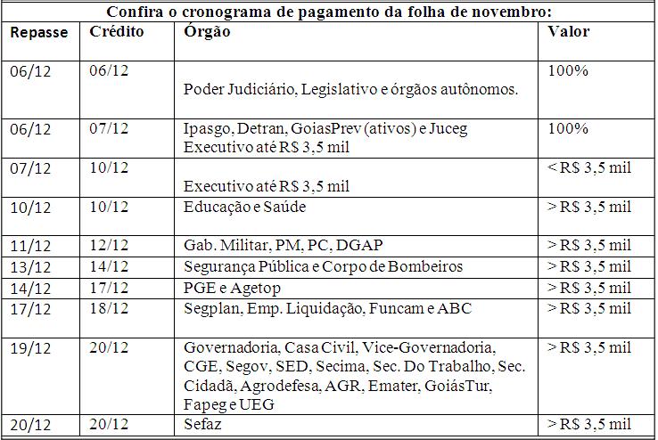 A folha integral do Detran, Ipasgo, GoiásPrev (ativos) e Juceg será creditada no dia 7 de dezembro. Os servidores do Executivo que ganham até R$ 3,5 mil, que representam 70% do quadro, terão os vencimentos repassados no dia 7 também. Mas, devido ao final de semana, a Sefaz informou que o dinheiro estará disponível na conta na segunda-feira (10).
