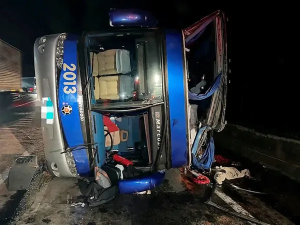 Veículo que levava romeiros para a cidade de Aparecida (SP) tombou na Rodovia Régis Bittencourt, em Cajati (SP)
