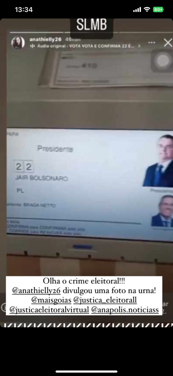 Em outro caso, também encaminhado à reportagem, uma eleitora publicou a foto do momento do voto nas redes sociais.