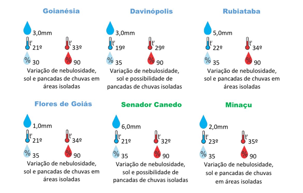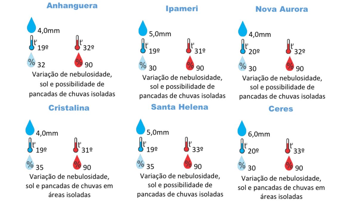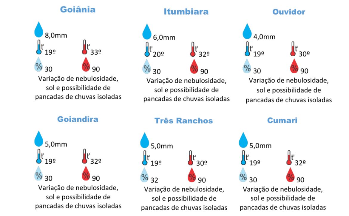 Confira abaixo a previsão do tempo para boa parte dos municípios de Goiás.