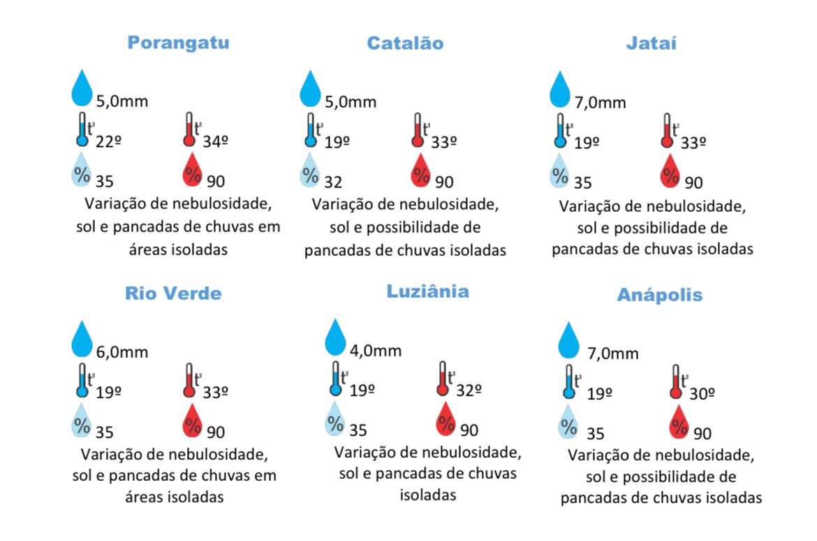 Conforme o Cimehgo, as informações contidas nesse boletim do tempo levam em consideração dados das variáveis meteorológicas previstas por modelos meteorológicos e análise de imagens de satélite do dia do dia 28/10/2022 às 7h horas.