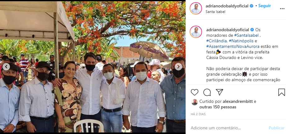 A prefeita de Santa Isabel, Márcia Dourado, do PSDB, realizou, no último sábado (28), um evento para comemorar sua reeleição no município, que fica a 155 quilômetros de Goiânia. O que chama a atenção é que o evento, cujas fotos mostram a gestora sem máscara ao lado dos convidados, foi realizado uma semana depois da Márcia revogar um decreto que proibia reuniões do tipo, devido as aglomerações provocadas.