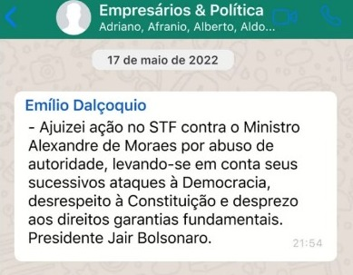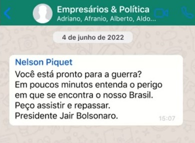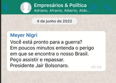 Em 17 de maio, às 22h02, Meyer Nigri enviou um texto supostamente assinado por Bolsonaro, abordando uma ação judicial que o político havia iniciado contra Alexandre de Moraes, acusando-o de abuso de autoridade. Em junho, Jair compartilhou um vídeo sobre a situação do Brasil e perguntou se as pessoas estavam prontas para a guerra, pedindo para assistir e repassar. Essa mensagem foi enviada ao grupo de empresários por Nigri, Luciano Hang e Nelson Piquet. A gravação consistia em um discurso público de Bolsonaro sobre a tentativa de desarmamento da população.