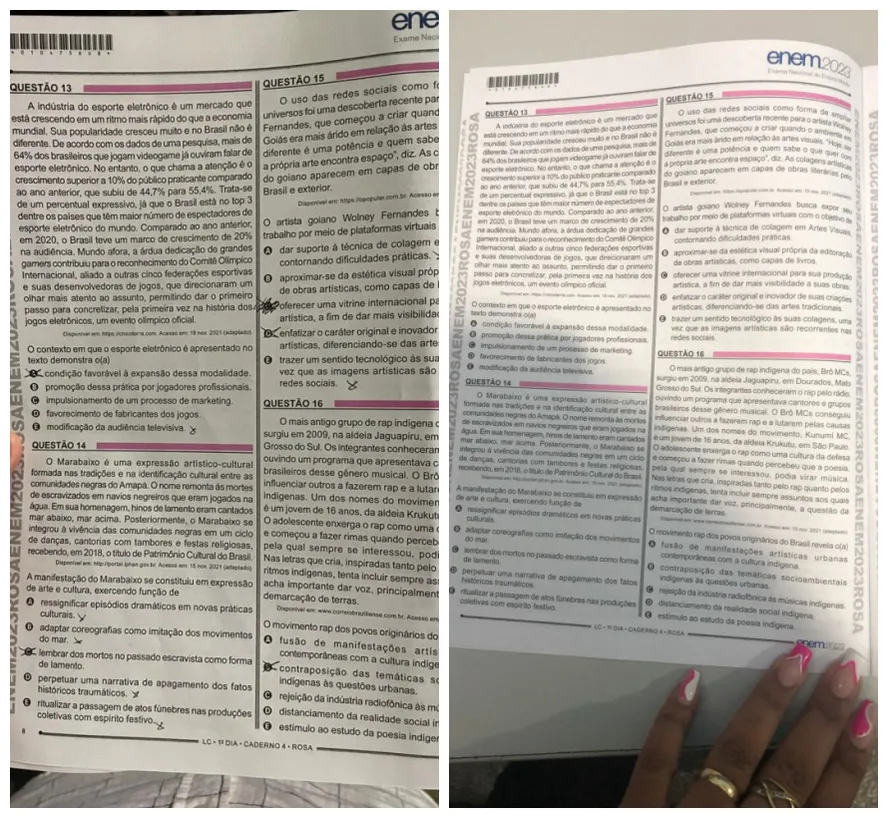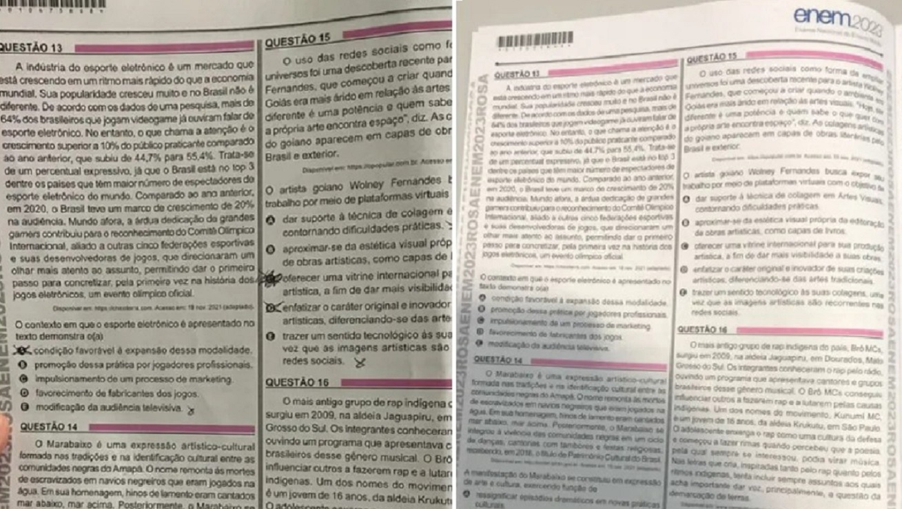 A PF também investiga a circulação de uma imagem da proposta de redação. É possível que sejam dois casos diferentes, já que a suposta prova completa é do caderno rosa e o primeiro caso é do branco.