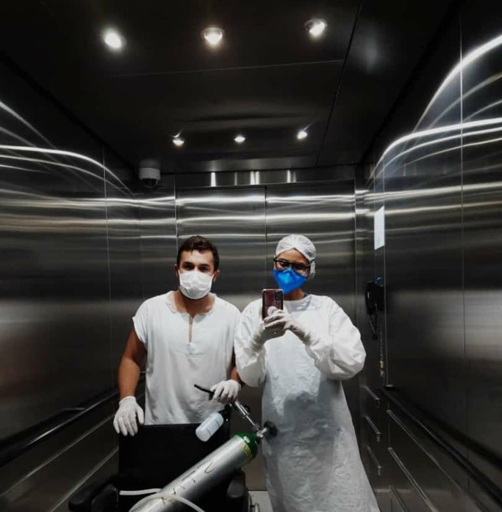 O vídeo viralizou nas redes sociais na última sexta (12). Nele, é possível ver a enfermeira Rebeka Fonseca – que espera pelo motorista Wadson Diniz – ao lado de fora do veículo. No vídeo também é possível ver a paciente com oxigênio, em cima da maca.