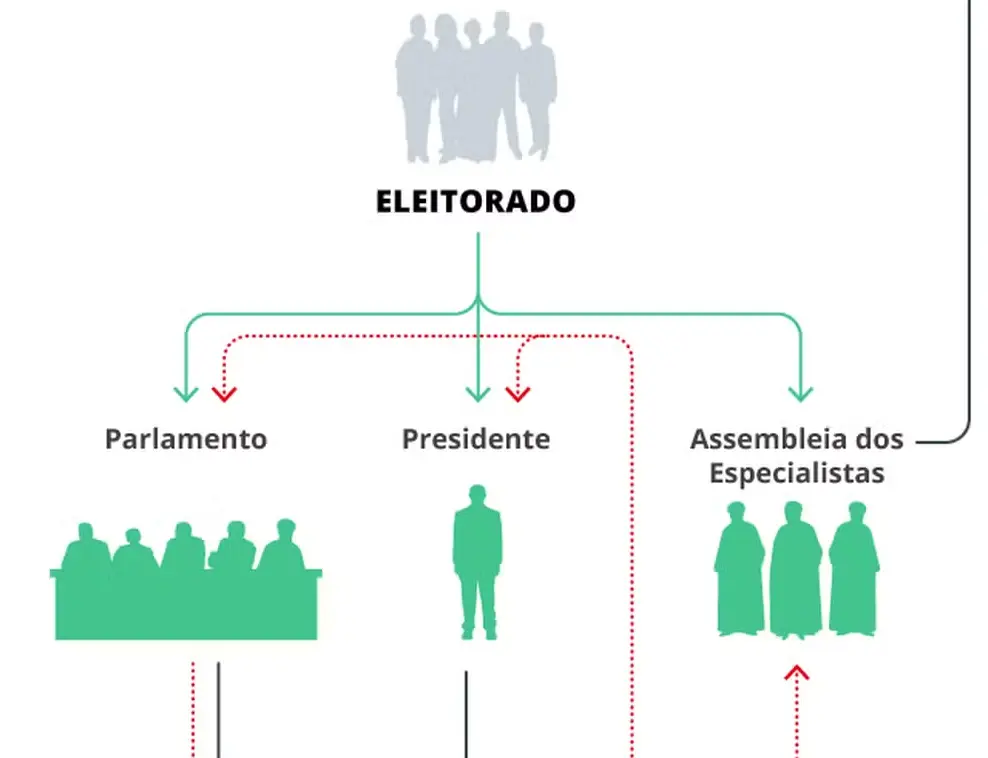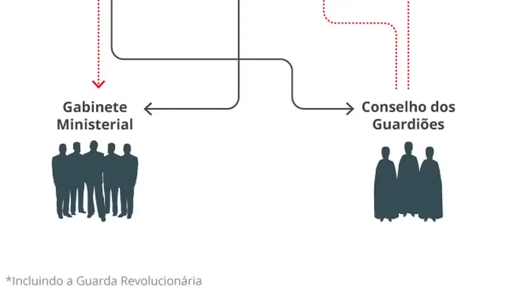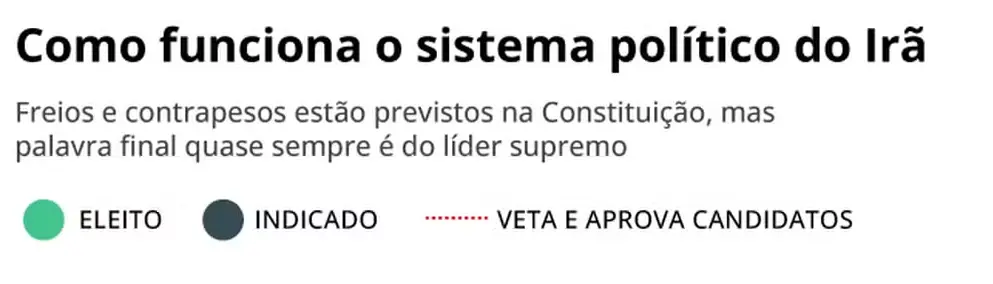 Abaixo de Khamenei está o presidente da República, Masoud Pezeshkian, eleito por voto popular em 2024. Com poderes limitados pela autoridade do líder supremo, o presidente atua principalmente na condução da política econômica e na administração do governo. O Parlamento, composto por 290 deputados eleitos a cada quatro anos, também tem suas decisões submetidas ao crivo do Conselho de Guardiões, responsável por revisar e aprovar as leis.