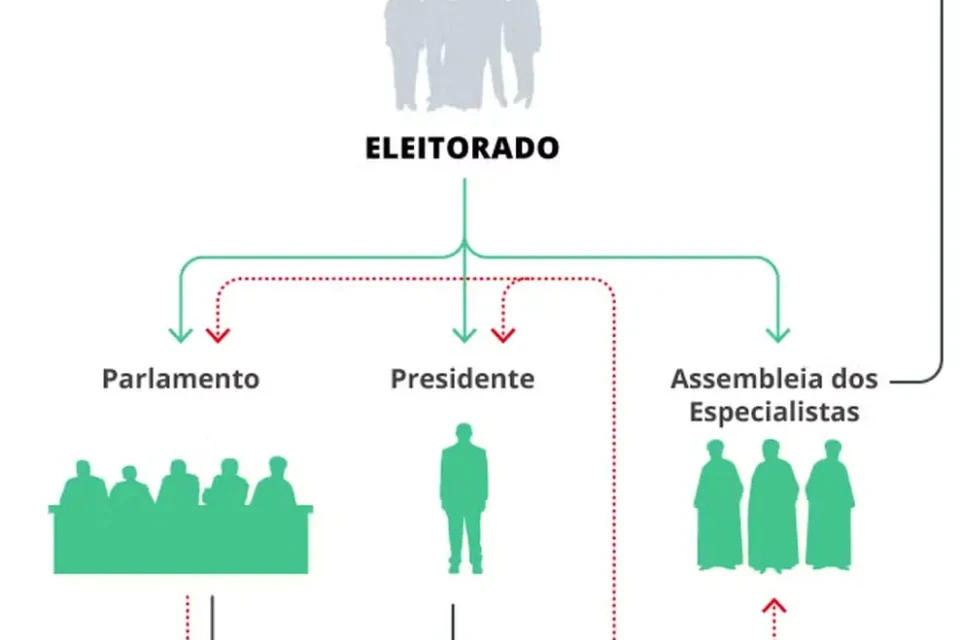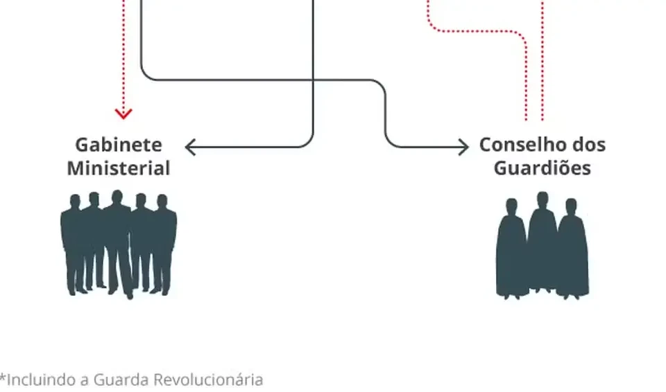Abaixo de Khamenei está o presidente da República, Masoud Pezeshkian, eleito por voto popular em 2024. Com poderes limitados pela autoridade do líder supremo, o presidente atua principalmente na condução da política econômica e na administração do governo. O Parlamento, composto por 290 deputados eleitos a cada quatro anos, também tem suas decisões submetidas ao crivo do Conselho de Guardiões, responsável por revisar e aprovar as leis.
