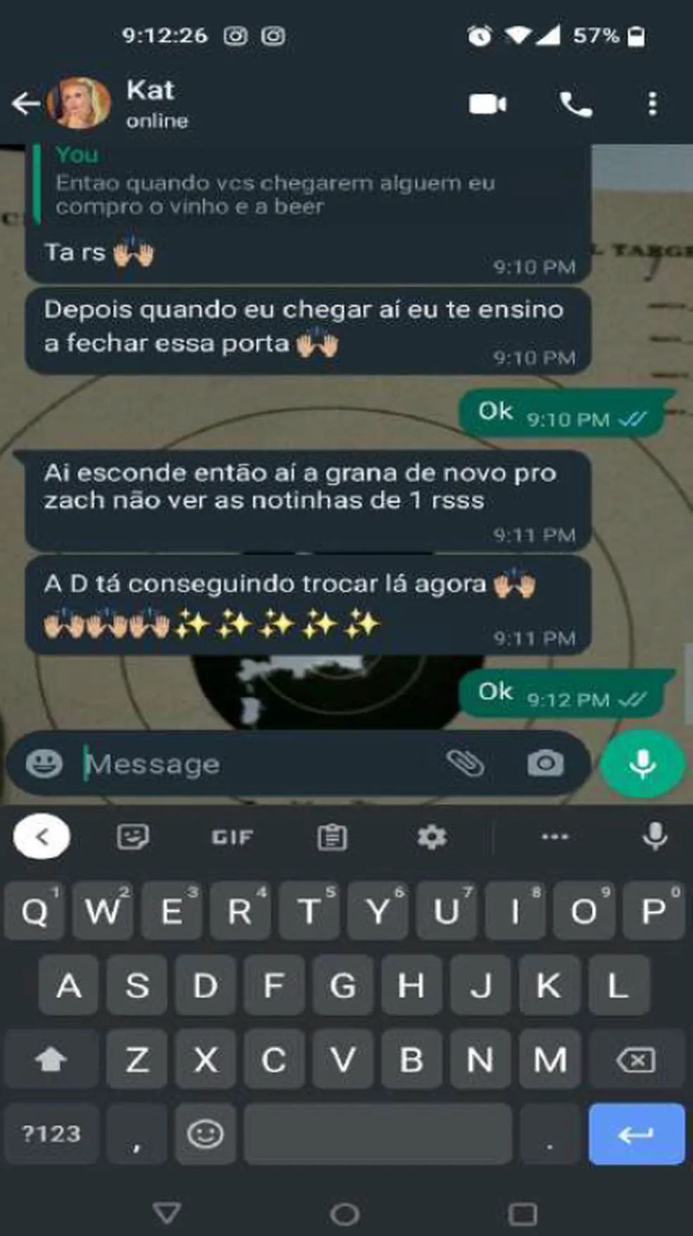 “Esconde então aí a grana de novo pro Zach não ver as notinhas de 1 (dólar) rsss“, diz Kat a uma das vítimas. “A D tá conseguindo trocar lá agora“.