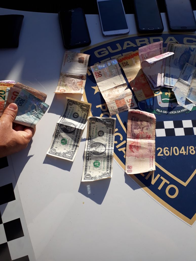 Com eles estavam cinco telefones celulares – dois deles do motorista assaltado –, uma arma de fogo e uma grande quantia, ainda não contabilizada, de dinheiro. Cédulas de dólar também estavam entre os itens. O carro, um Ford Ka, foi entregue ao proprietário. Veja foto a seguir: