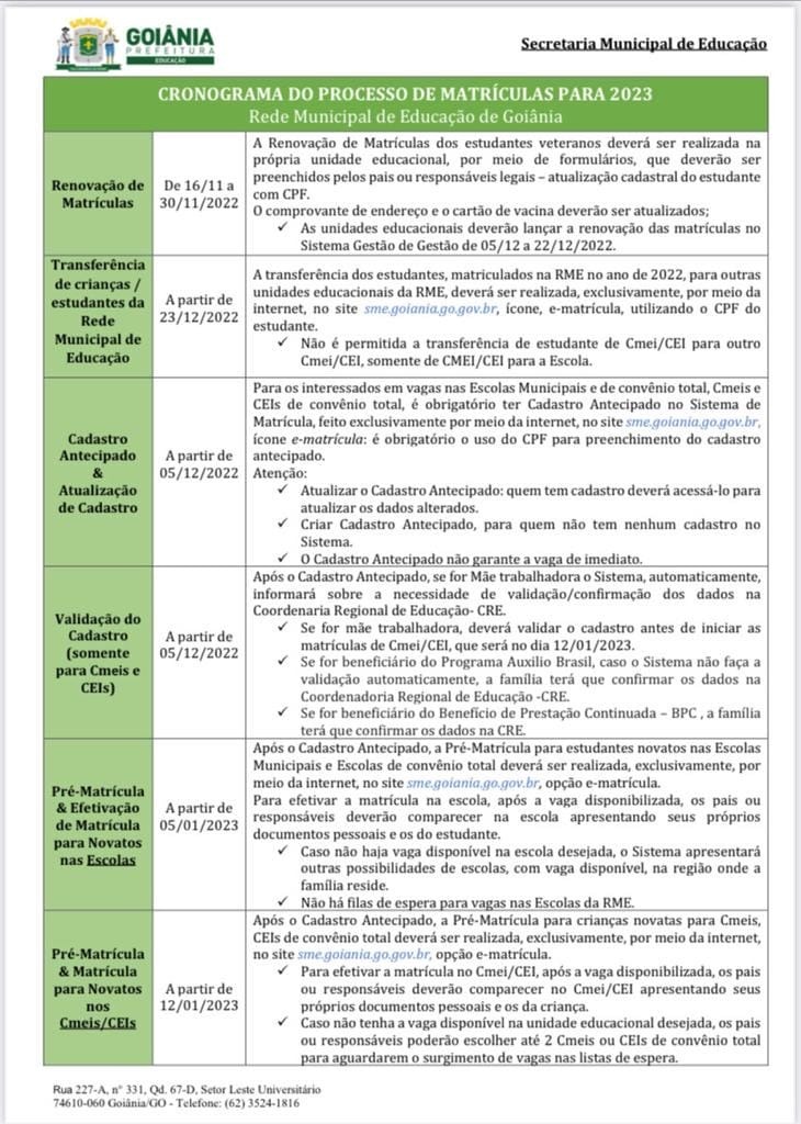 O cronograma de matrículas para 2023 prevê, ainda, o início do Cadastro Antecipado para os Centros Municipais de Educação Infantil (Cmeis) e Centros de Educação Infantil (CEIs) para o dia 05 de dezembro. Nesta fase, os pais e responsáveis devem cadastrar informações pessoais das crianças no sistema da Prefeitura de Goiânia.