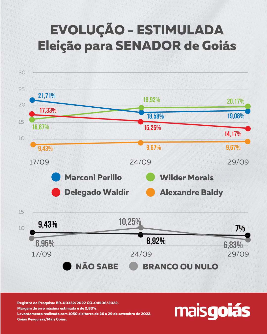Wilder Morais (PL) marcou 16,67%% em 17 de setembro, 19,92% em 24 de setembro e 20,17% neste sábado (1º). Na mesma sequência de datas, o ex-governador Marconi Perillo (PSDB) fez 21,71%, 18,58% e 19,08%.