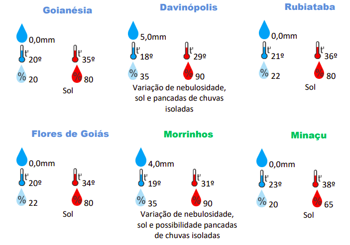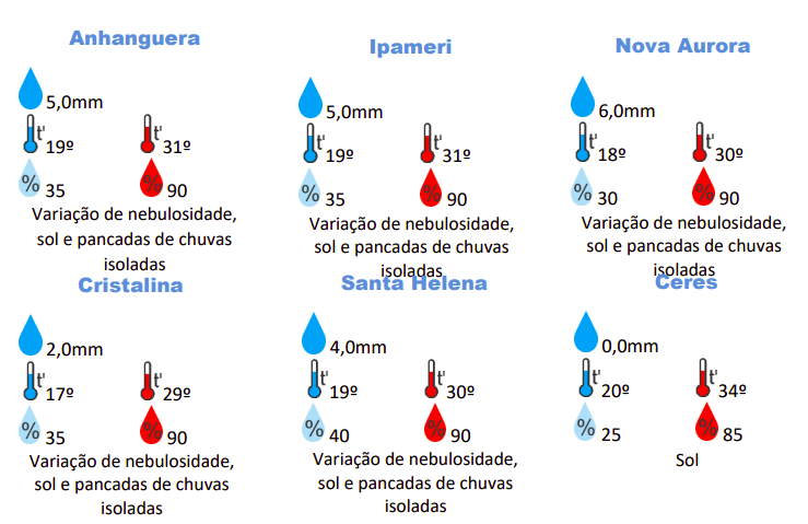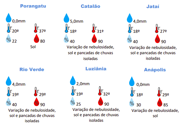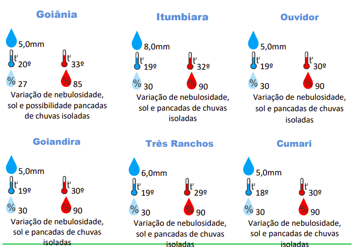 Confira abaixo a previsão do tempo para os municípios do Estado de Goiás: